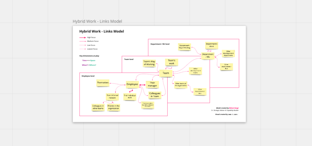The Links Model of Hybrid Work is the big picture that might help you, your team and your organization design better hybrid work setups, that will help you achieve the desired business results and strategy, even when people in your organization won't always work at the same time, in the same place.